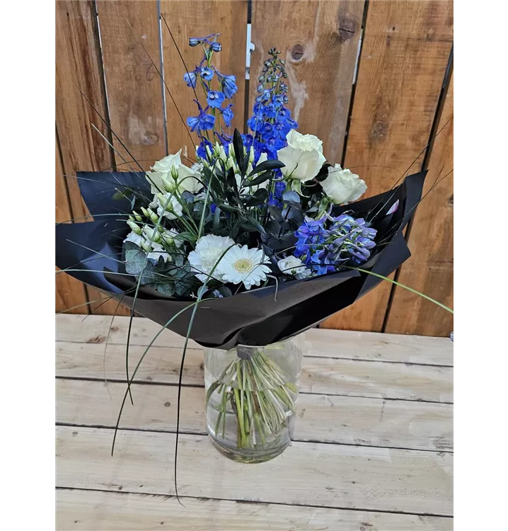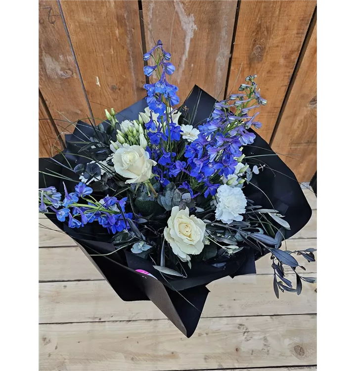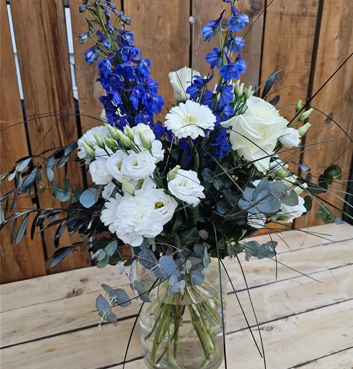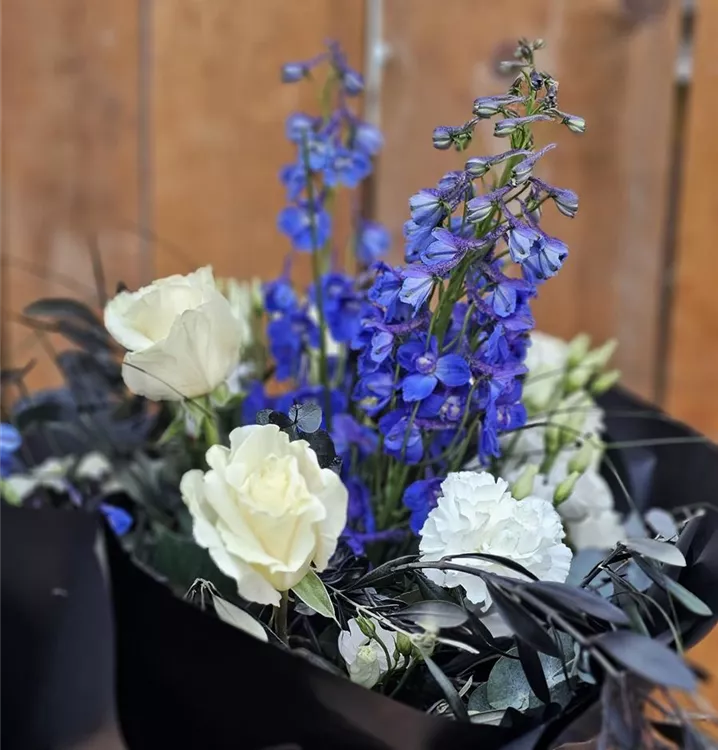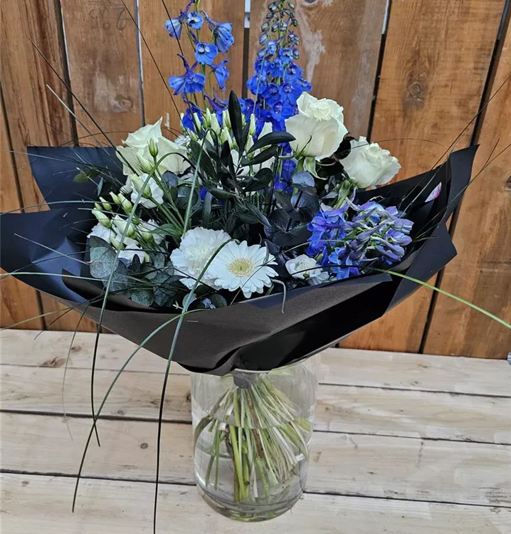 Für diesen besonderen Strauß bitten wir um Vorbestellung – blaue Blüten sind selten und brauchen 2–3 Tage Vorlaufzeit. Die Vase ist nicht im Preis enthalten. Der Strauß auf dem Foto entspricht der Variante L.