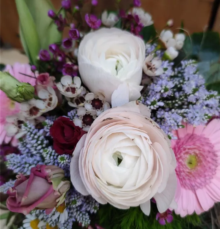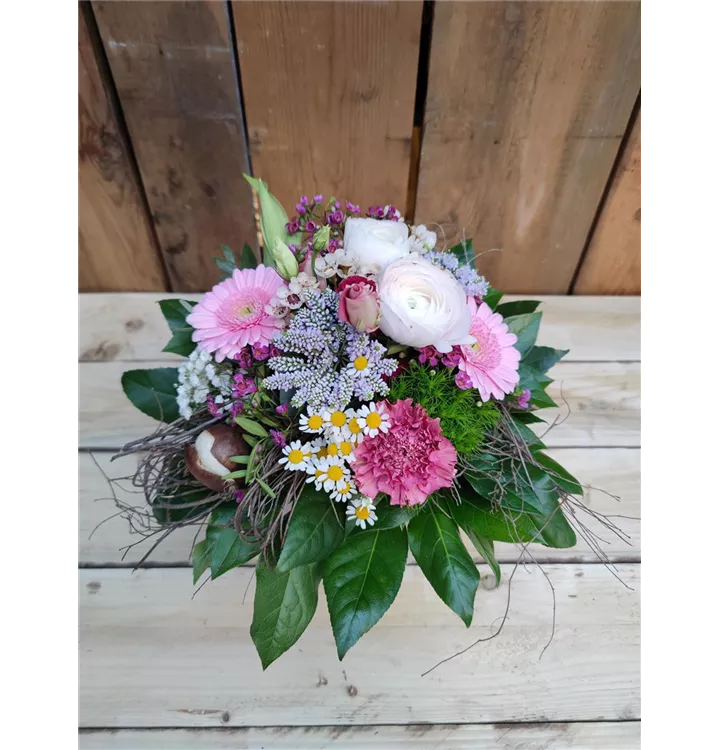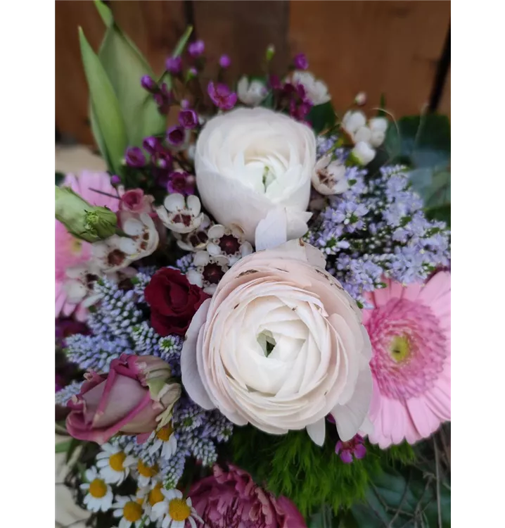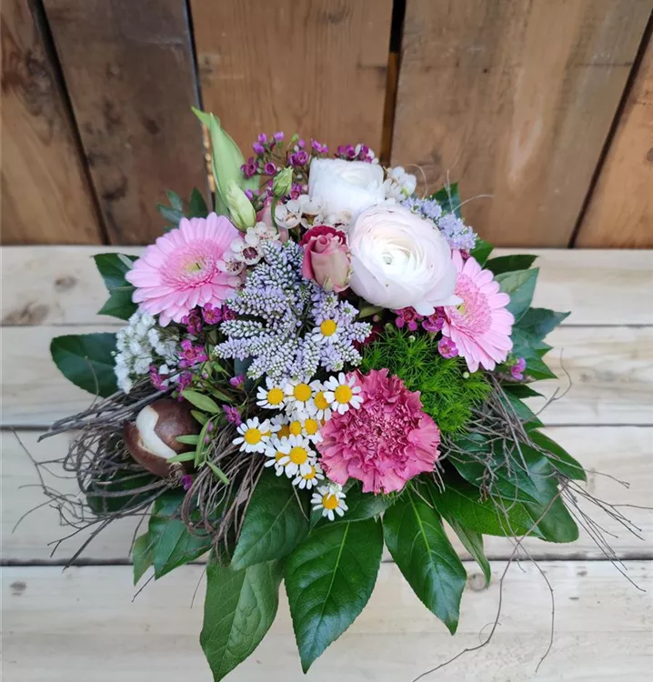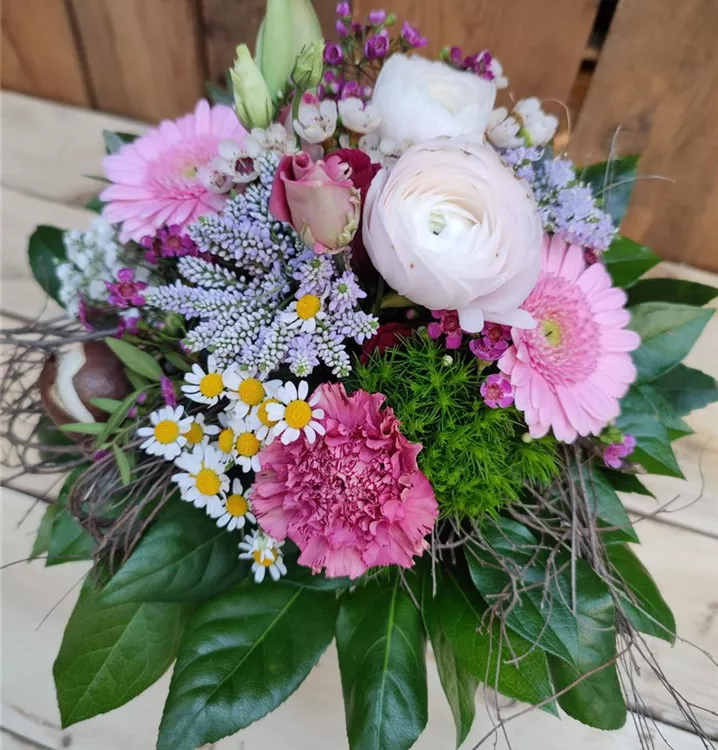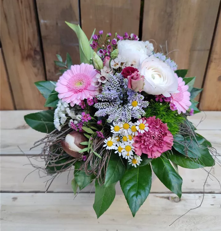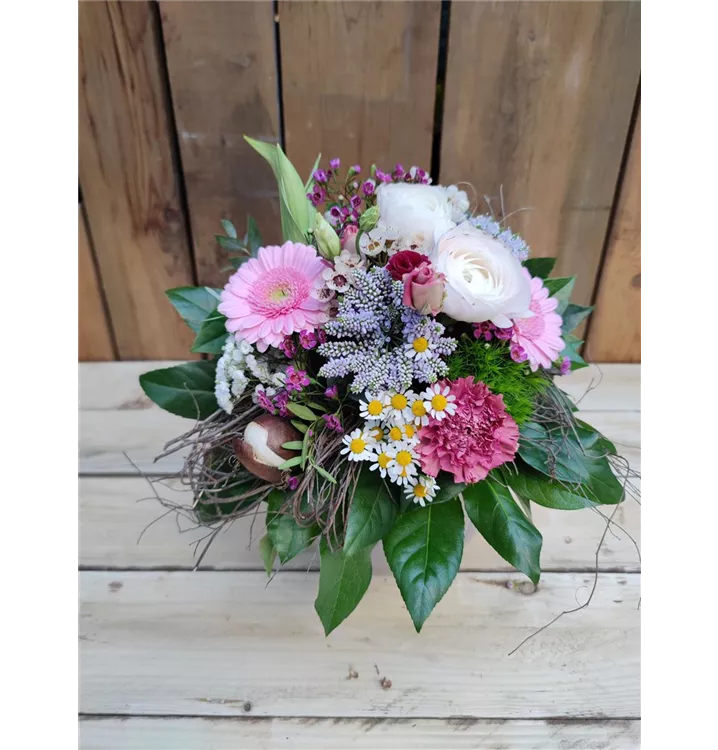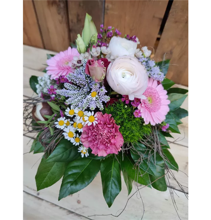 Strauß in rosa-tönen dazu passendes Beiwerk. Auf dem Foto ist die die Variante "M" abgebildet. Die Vase ist nicht im Preis enthalten. Der Strauß kann je nach Verfügbarkeit der Produkte von der Abbildung abweichen.