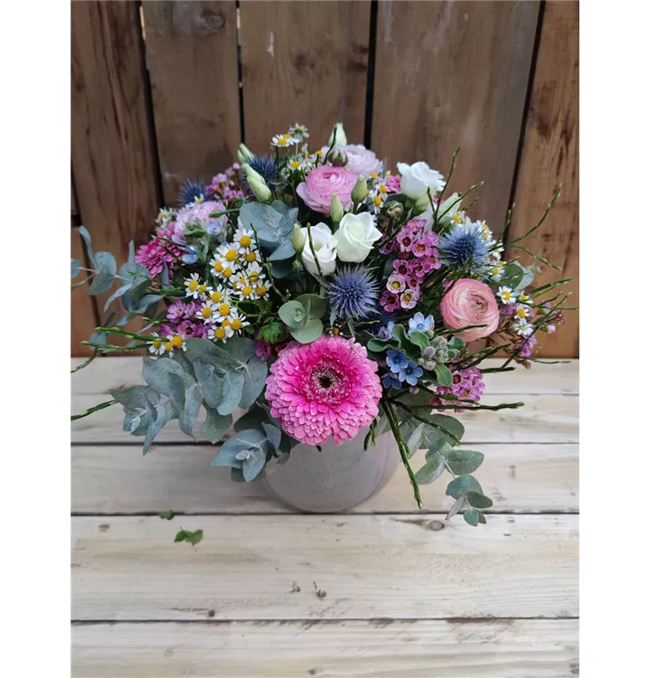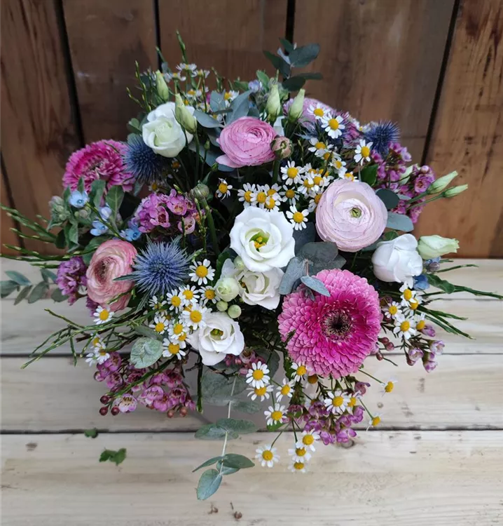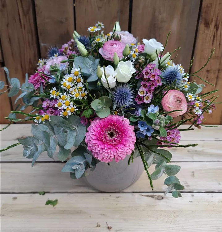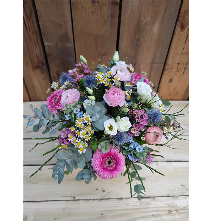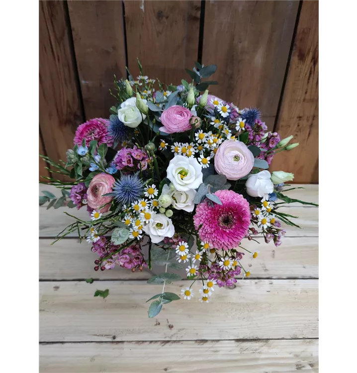 Frühling in Farbspiel von rosa / pink / blau und weiß. Kleine und großere Blüten ergeben eine wunderbare Komposition. Das Foto zeigt die Variante L. Die Vase ist nicht im Preis enthalten. Je nach Verfügbarkeit und Vorlaufzeit der Bestellung kann es zu Abweichungen bei der Blumenauswahl kommen.