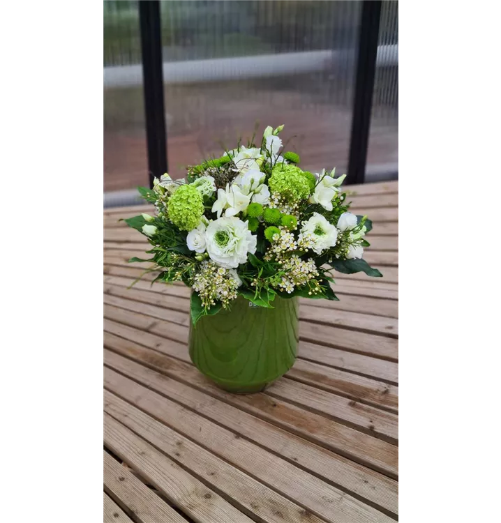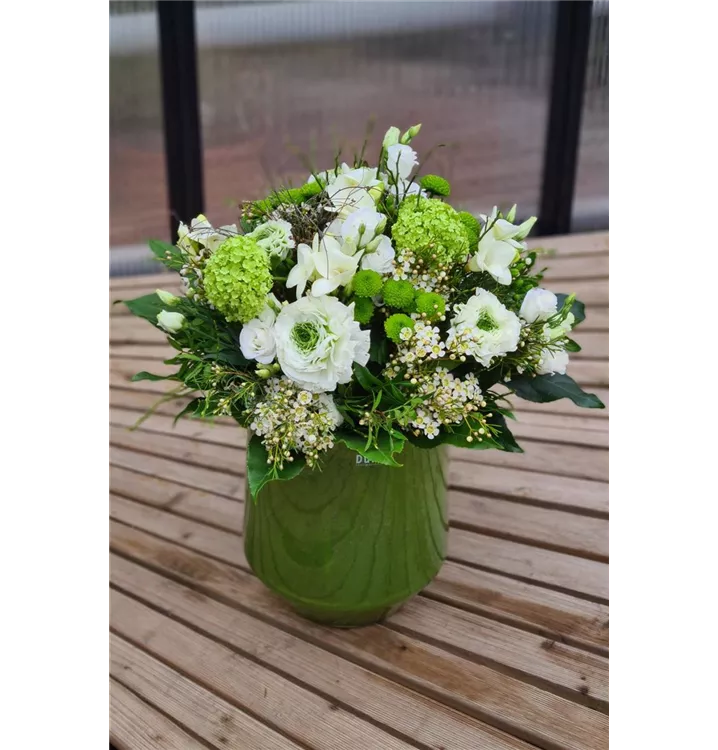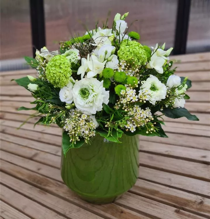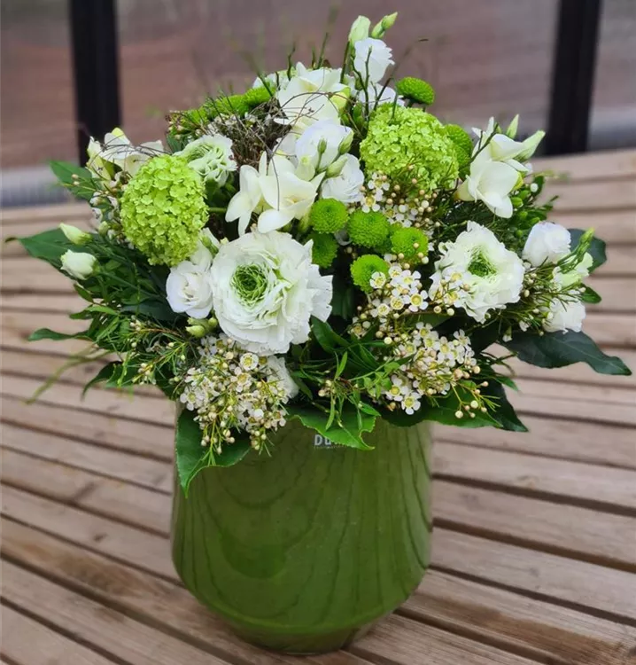 Der Blumenstrauß ist in den Farben grün und weiß gehalten, je nach Verfügbarkeit wird er mit Ranunkeln, Freesien und Schneeball gebunden. Die Dutz-Vase ist nicht im Preis enthalten. Das Foto entspricht der Variante M.