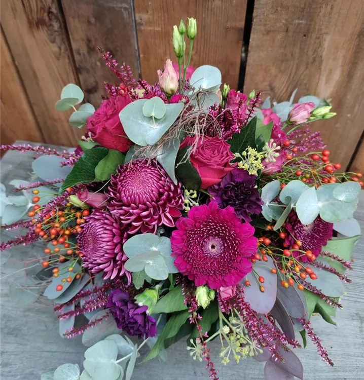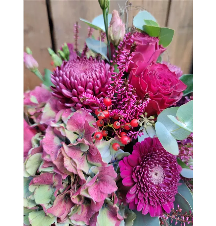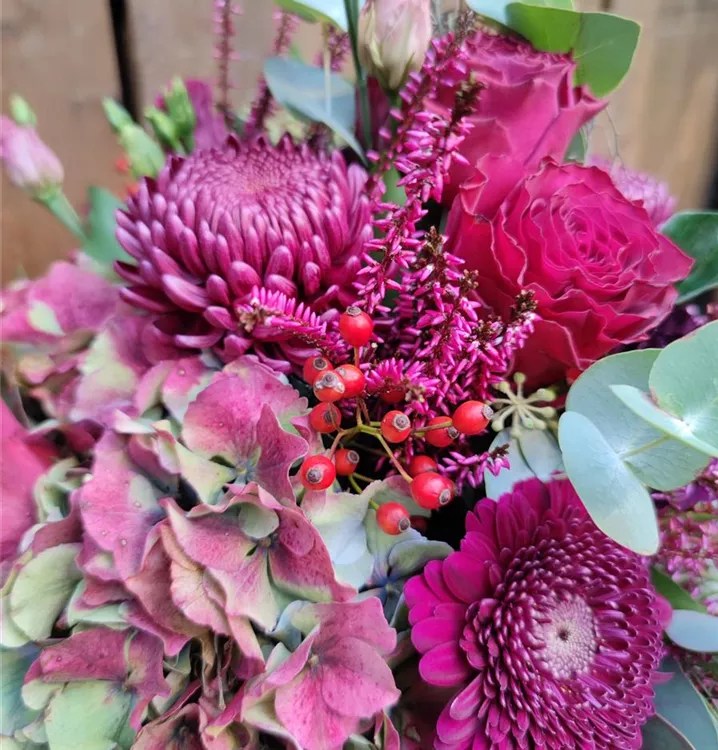 Pink und bordeauxfarbener Strauß mit Rosen, Eustoma, Gerbera und Chrysanthemen.