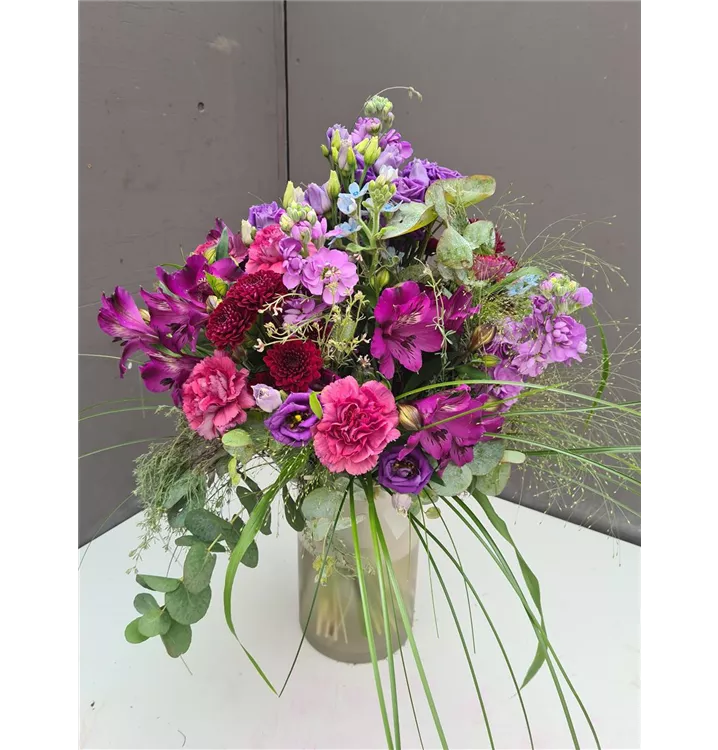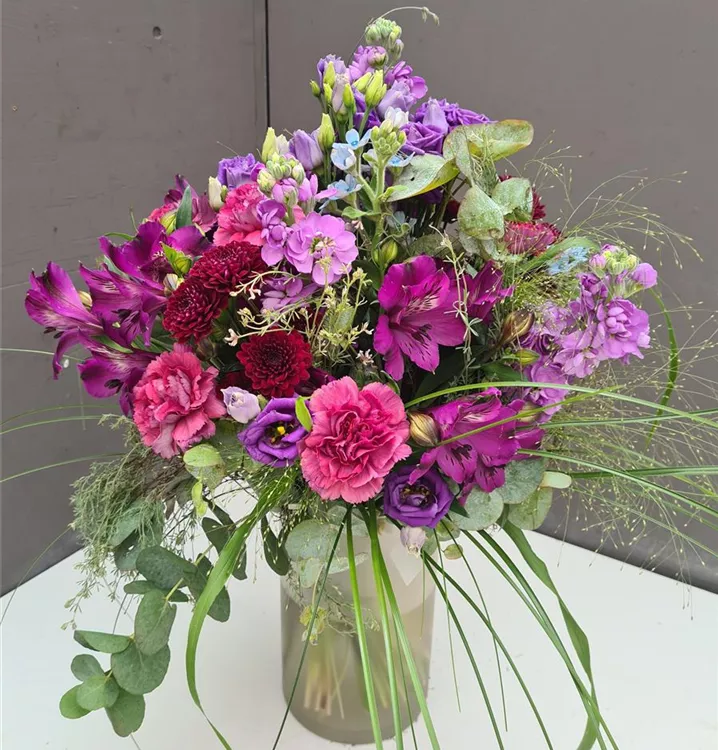 Ein locker gebundener Strauß mit lila Blüten und kräftigen Farben. Definitiv ein Hingucker.