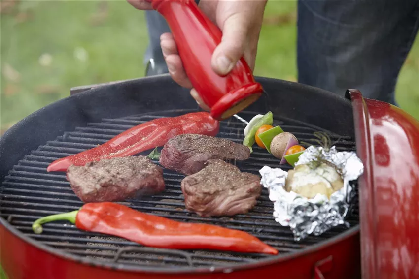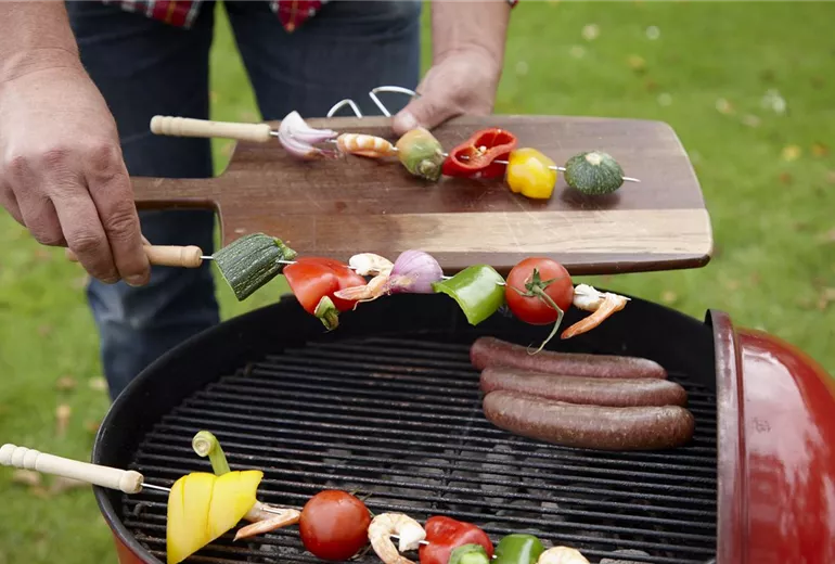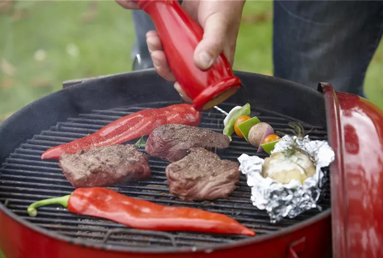 Wer Grillen im Garten plant, muss sich als Erstes für ein Gerät entscheiden. Nach wie vor beliebt ist der Holzkohlegrill, weil hier die Erfahrung mit dem Element Feuer so unmittelbar ist und man noch lange die wärmende Glut genießt. Die Vorteile beim Gasgrill sind, dass auf keinen Fall Qualm entsteht und das Grillen im Garten auf den Punkt losgeht. Hungrige Gäste laufen nicht ungeduldig auf und ab. Noch überzeugender ist der Faktor Zeit beim Elektrogrill. Jedoch muss eine Steckdose in Griffweite sein, es gibt kein Rauch-Aroma, und viele vermissen die Natürlichkeit. In jedem Fall praktisch beim Grillen im Garten ist ein Grill- oder Servierwagen, denn irgendwo müssen die Leckereien ja auf ihre Zubereitung warten. Nützliche Zusatz-Ausstattungen sind Messgeräte, z. B. für die Restfeuchte im Holz und für die richtige Temperatur beim Grillgut. Grillschalen und -pfannen haben sich weitgehend durchgesetzt. Das ist vor allem sinnvoll, weil sie Marinaden und Fette von der Glut fernhalten und daher keine Schadstoffe entstehen. Für alle Anhänger größtmöglicher Sicherheit gibt es den Vertikal-Grill, bei dem garantiert nichts auf die falsche Stelle tropft. Wenn die schmackhafte Kost auf den Teller kommt, ist dekoratives Geschirr das I-Tüpfelchen. Warum fade Pappe oder umweltfeindliches Plastik nehmen? Das Auge isst mit beim Grillen im Garten.