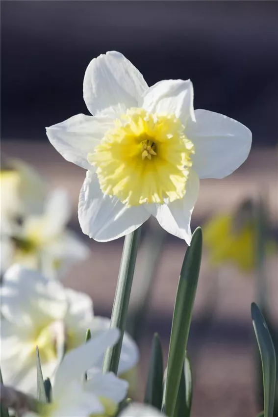 Narcissus, großkronig Narzissen können Sie hervorragend mit anderen Frühlingsblühern wie Tulpen und Winterlingen kombinieren. So gestalten Sie ein frühlingshaftes Beet mit berauschender Farbenpracht! Narzissen blühen in der Regel in kräftigen Gelbtönen. Sie bringen die Sonne ins Blumenbeet. Aber auch andere Farbkombinationen mit Weiß- oder Lilatönen können Sie für Ihre Gartengestaltung verwenden. Wenn die Narzissen ab April oder Mai verwelken, schneiden Sie das Laub nicht gleich ab. Erst wenn es sich vorsichtig lösen lässt, sollten sie es entfernen, um der Pflanze nicht zu schaden.