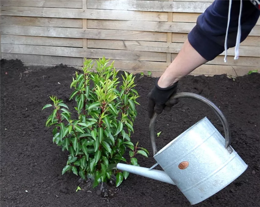 Portugiesischer Kirschlorbeer - Einpflanzen im Garten (5) Auf jeden Fall muss die Pflanze an ihrem neuen Standort gründlich angegossen werden.