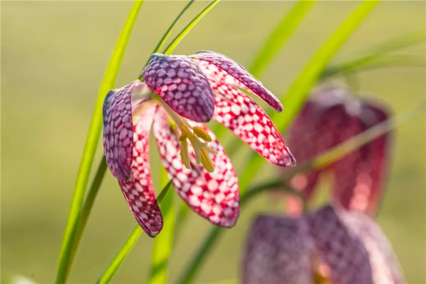 Fritillaria meleagris Schachbrettblumen haben keinen ihrer Namen von ungefähr. Im botanischen Namen findet sich eine Anspielung auf das Perlhuhn (Numida meleagris), dessen Gefieder der Zeichnung der Blume ähnelt. Landläufig wird die Blüte mit einem Schachbrett oder einem Kiebitzei verglichen. Die besondere Zeichnung macht Schachbrettblumen zu einem besonderen Hingucker im Garten. Sie werden bis zu 35 Zentimeter hoch. Schmale, elegante Blätter umrahmen die glockenförmige und überhängende Blüte. Mit ihrer Blütezeit von April bis Mai gelten Schachbrettblumen als Frühblüher. Bei allen unter Naturschutz stehenden Pflanzen sollten Sie beim Kauf die Herkunft hinterfragen. Kaufen Sie nur Pflanzen, die definitiv aus gärtnerischer Vermehrung stammen!