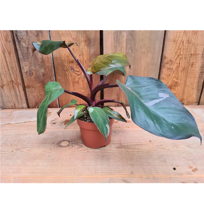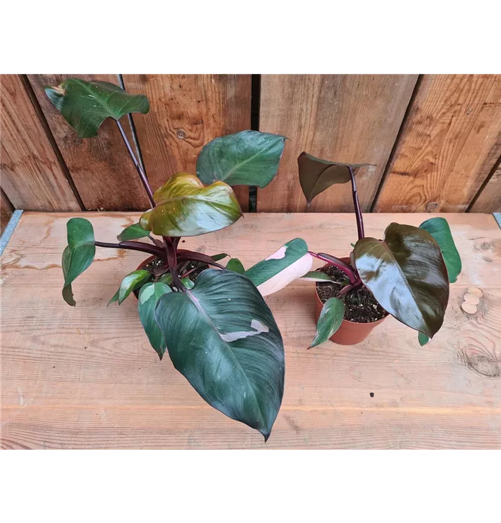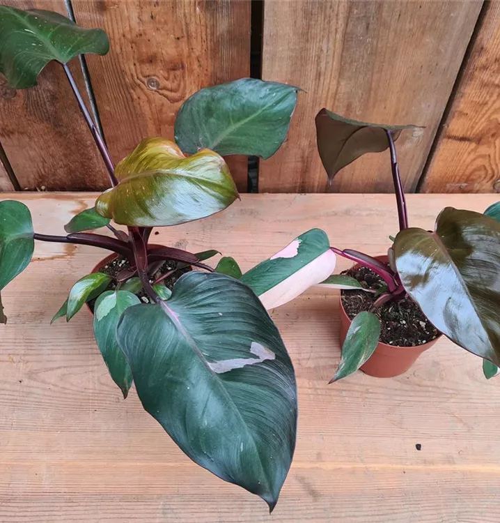 Fast schwarze und leuchtend pink panaschierte Blätter. Wunderschöne Kletterpflanze, die sich mit der Zeit verwandelt. Das rosa-weiße Muster verwandelt sich in strahlendes Pink.